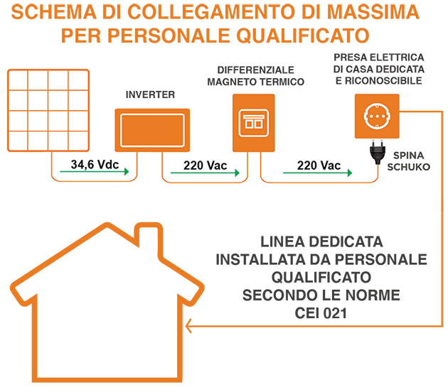 Semplicemente collegando l'inverter, attraverso una spina conforme alla norma CEI-021, ad una presa di casa dedicata l'energia generata dai pannelli viene immessa nel proprio impianto elettrico e viene utilizzata da tutti i dispositivi collegati all'interno della casa.